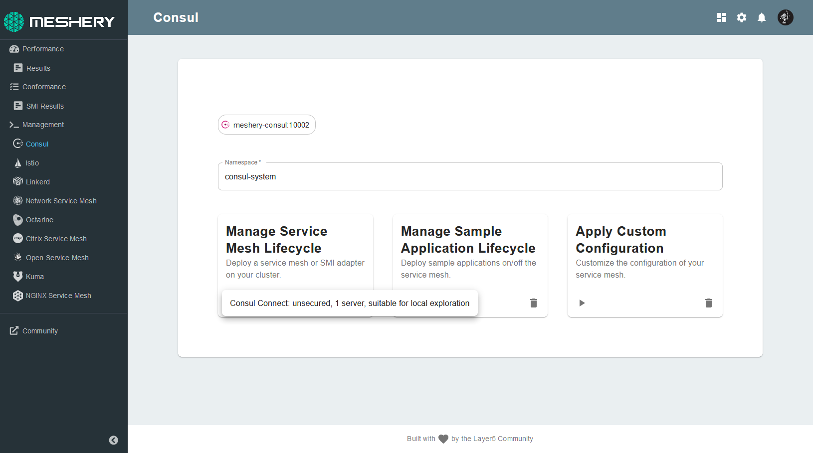 In Meshery's UI, choose the Meshery Adapter for Consul.
