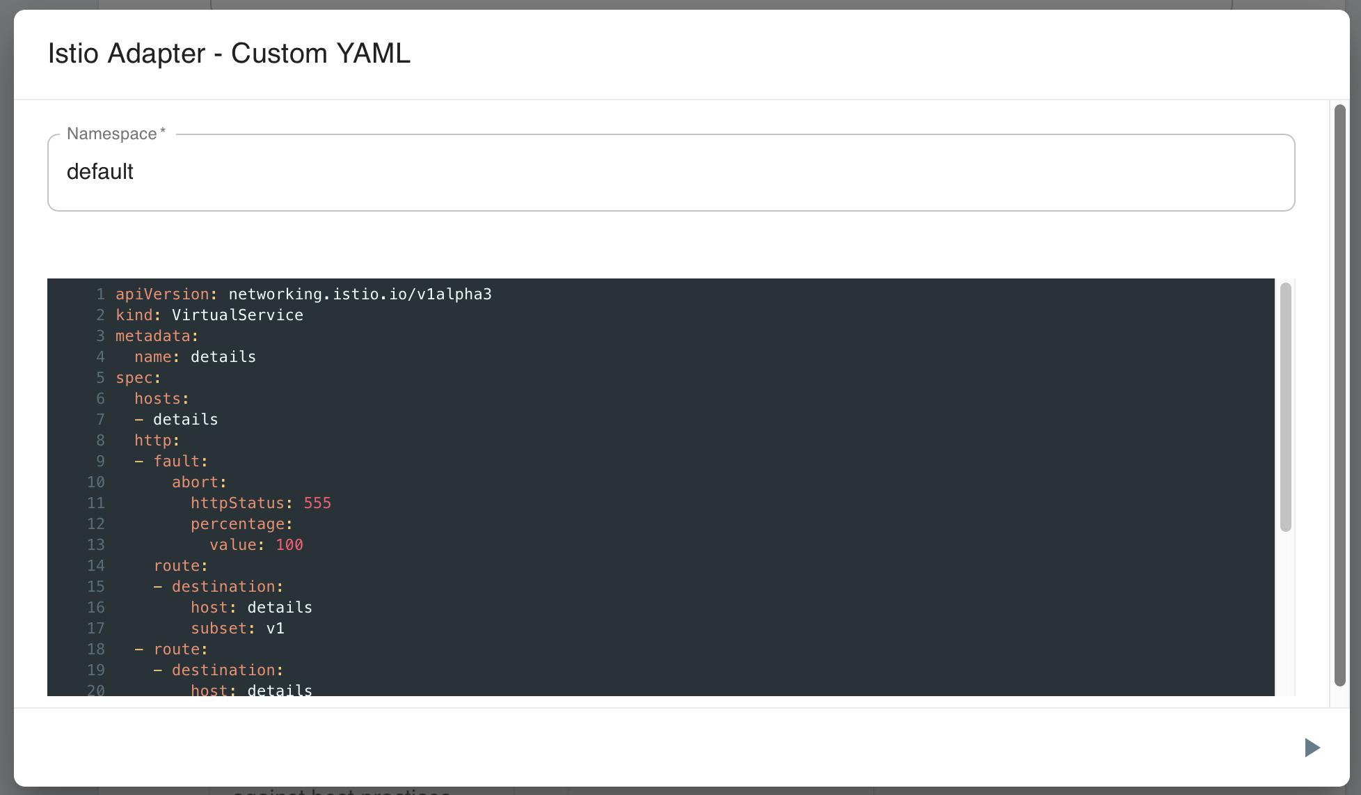 Meshery allows you to apply configuration to your infrastructure deployment. You can paste (or type in) any Kubernetes manifest that you would like to have applied to your infrastructure, in fact, you can apply any configuration that you would like to your Kubernetes cluster. This configuration may be VirtualServices, DestinationRules or any other custom Istio resource.