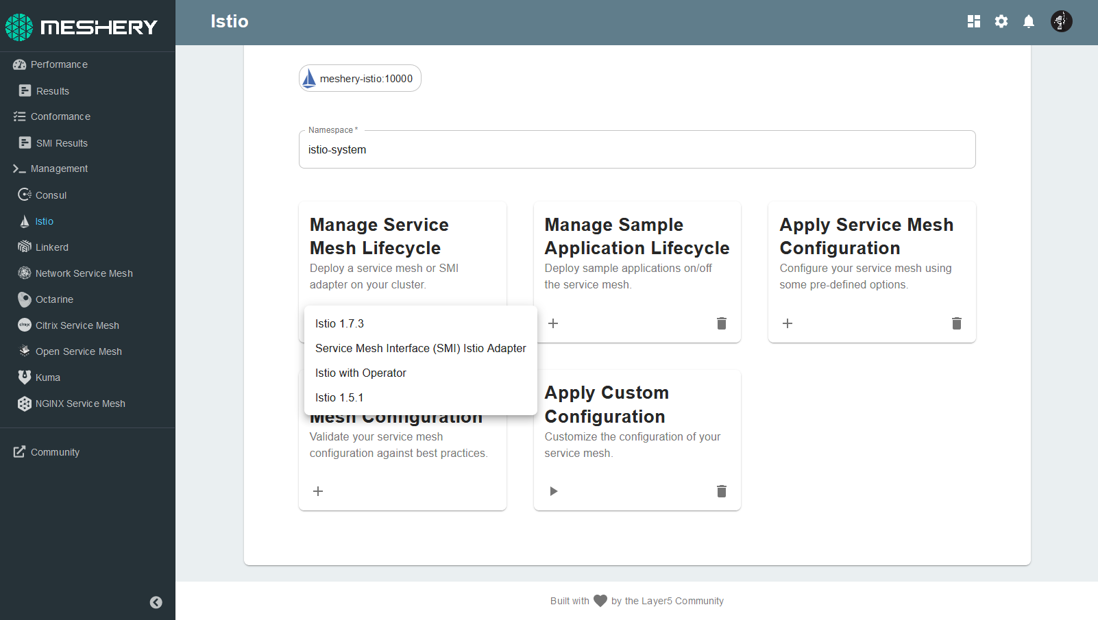 The Meshery Adapter for Istio can install v1.6.0 of Istio. A number of sample applications can be installed using the Meshery Adapter for Istio.