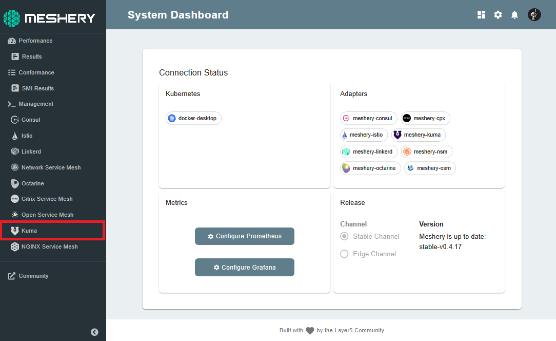 In Meshery's UI, choose the Meshery Adapter for Kuma.