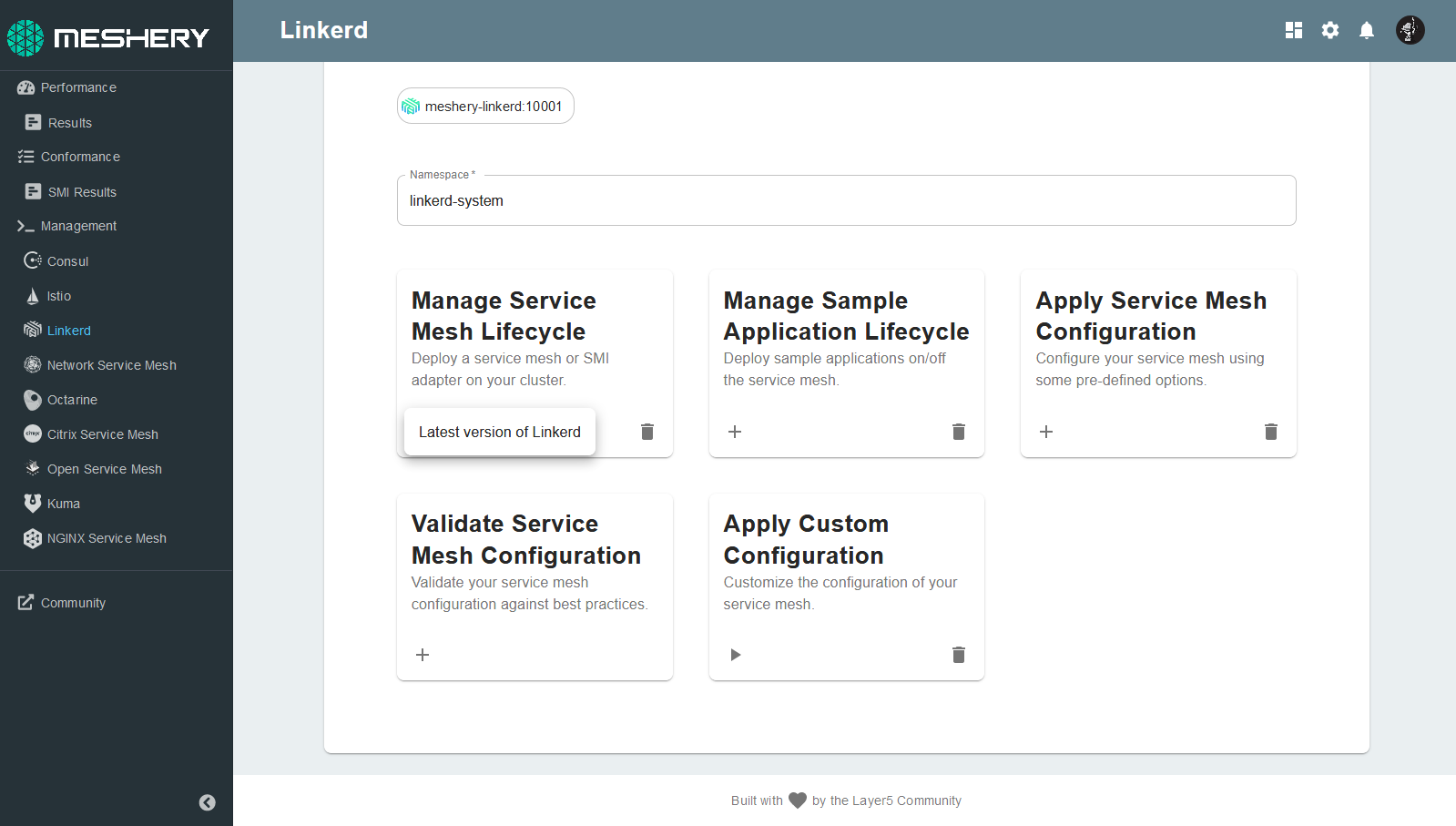 The Meshery Adapter for Linkerd can install v2.10.2 of Linkerd. A number of sample applications can be installed using the Meshery Adapter for Linkerd.