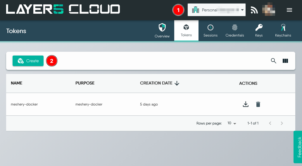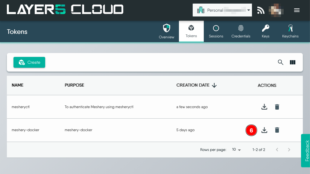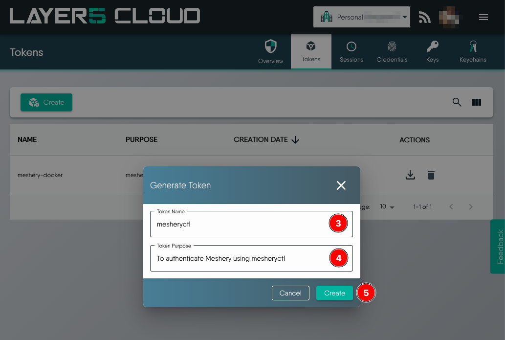 - Navigate to https://cloud.layer5.io/security/tokens and sign-in. Ensure you are in the right organization and click Create.