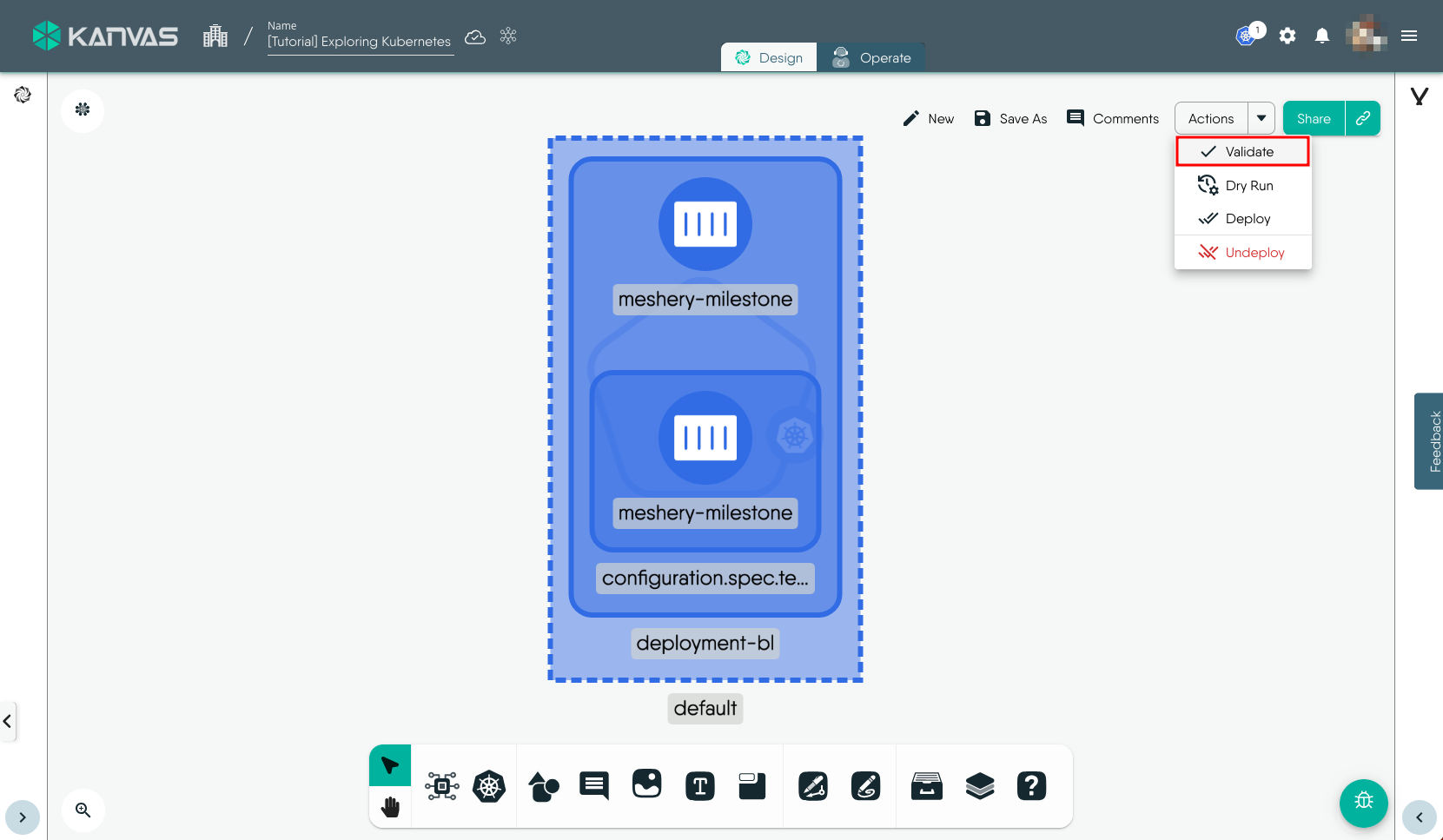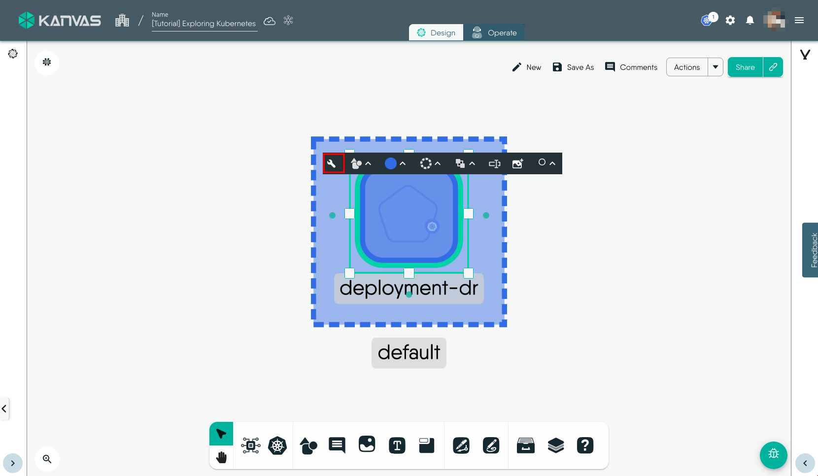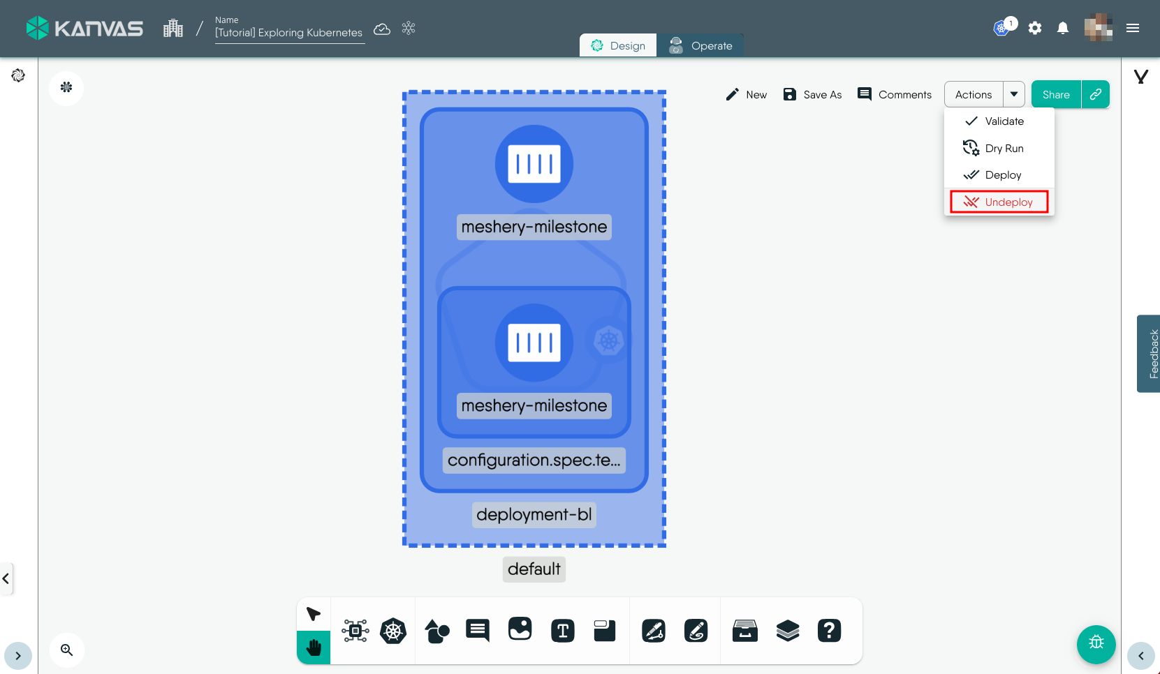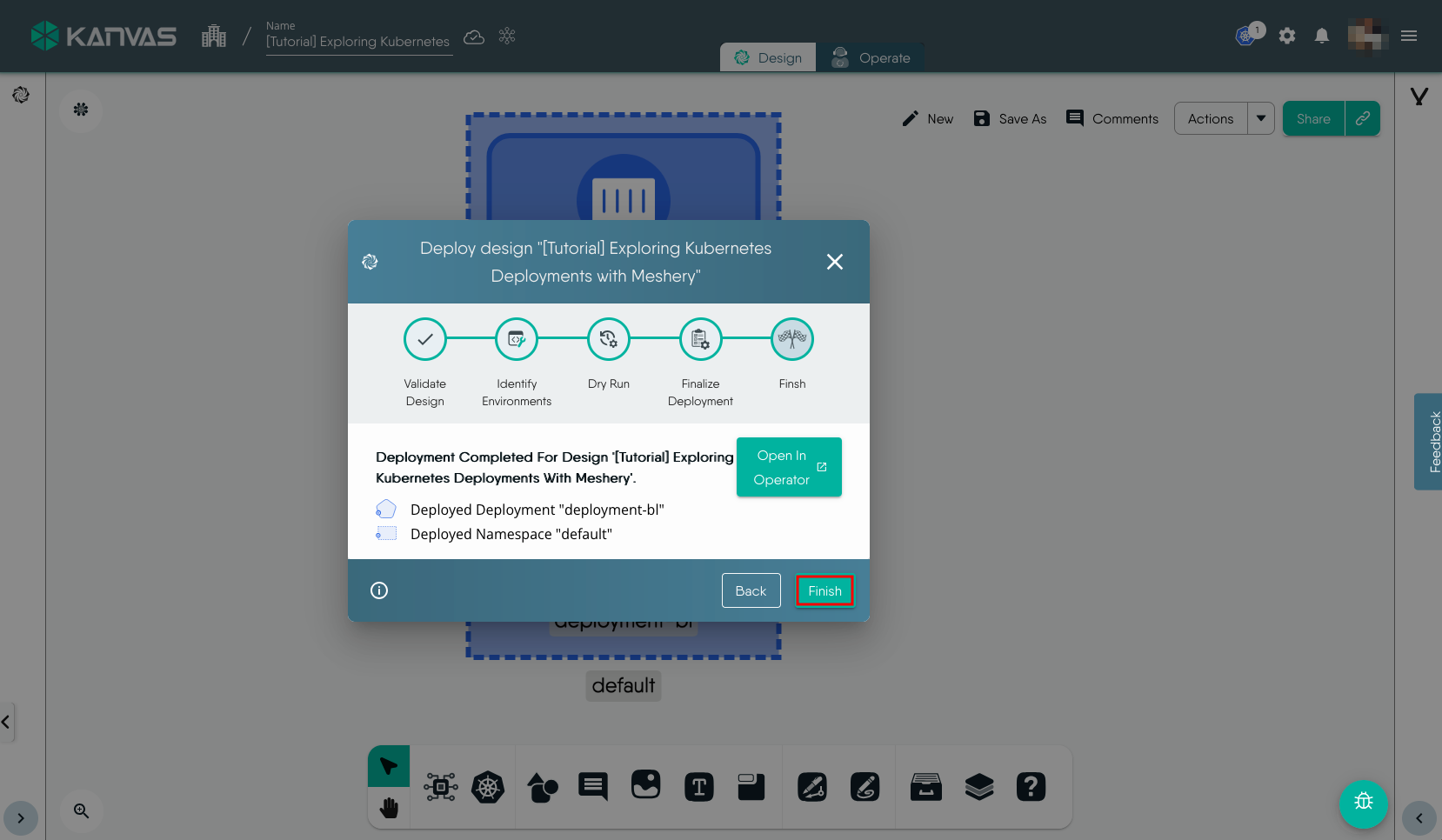 To view and perform operations on the resources deployed, i.e. the Deployment in this exmaple, we will use the Operate functionality of Kanvas. You can open the design in Operate mode during the Deploy workflow or later by click the Operate tab. It will load the deployed resources in Operate view similar to the screenshot below.