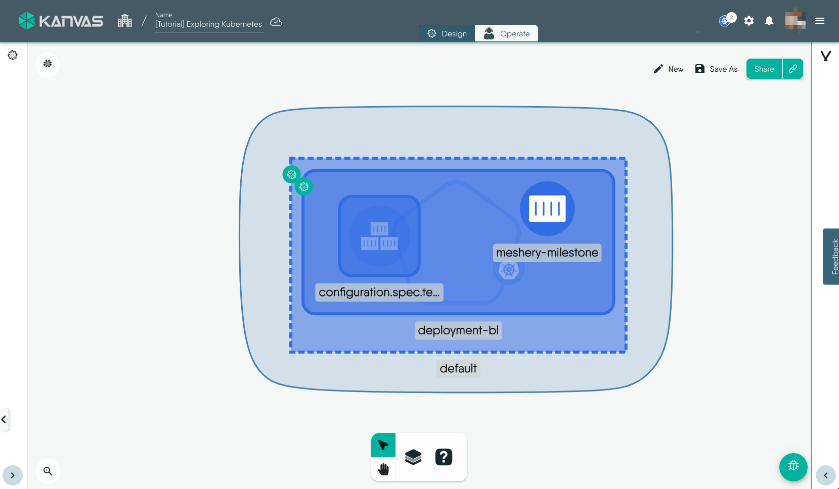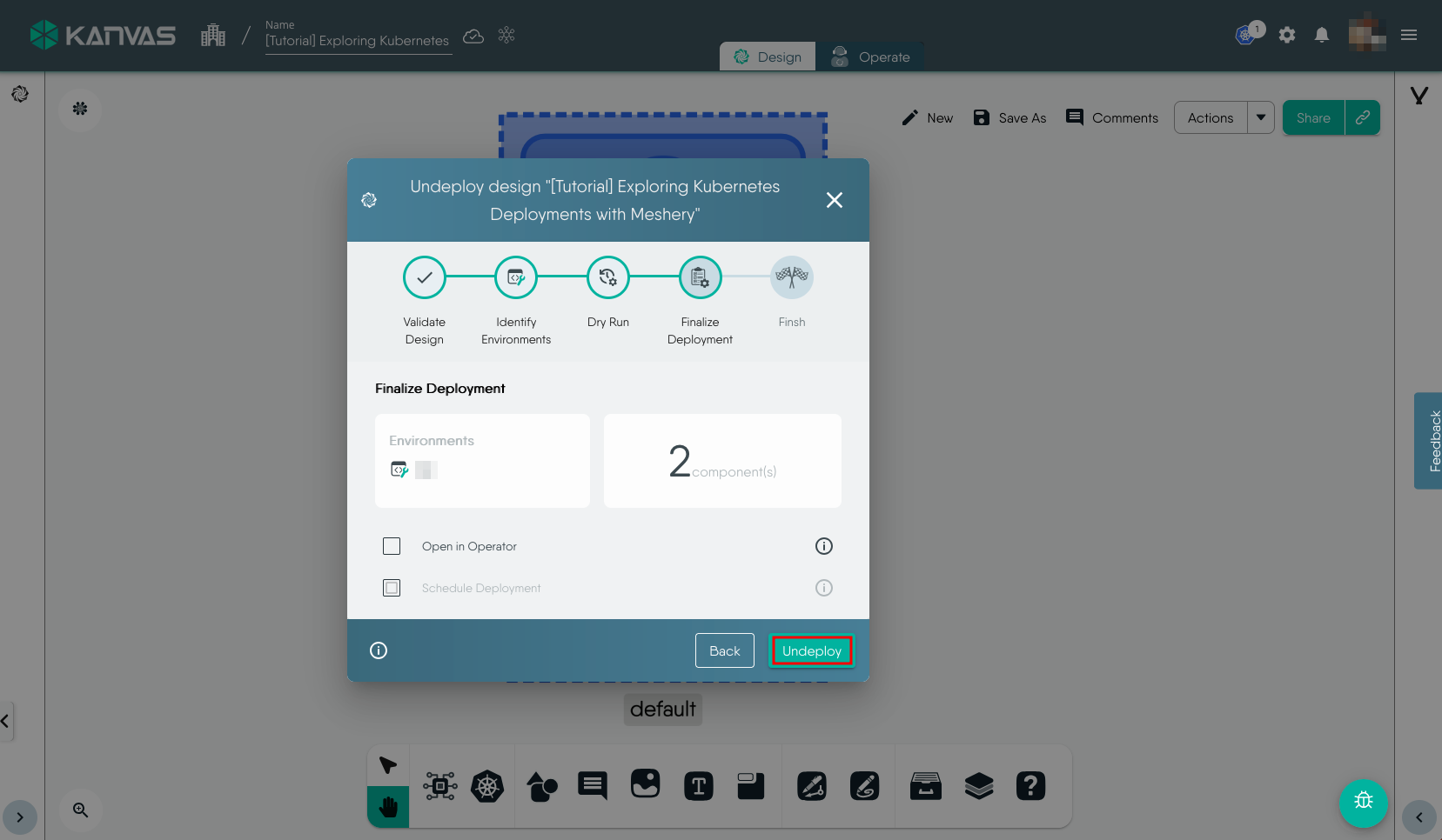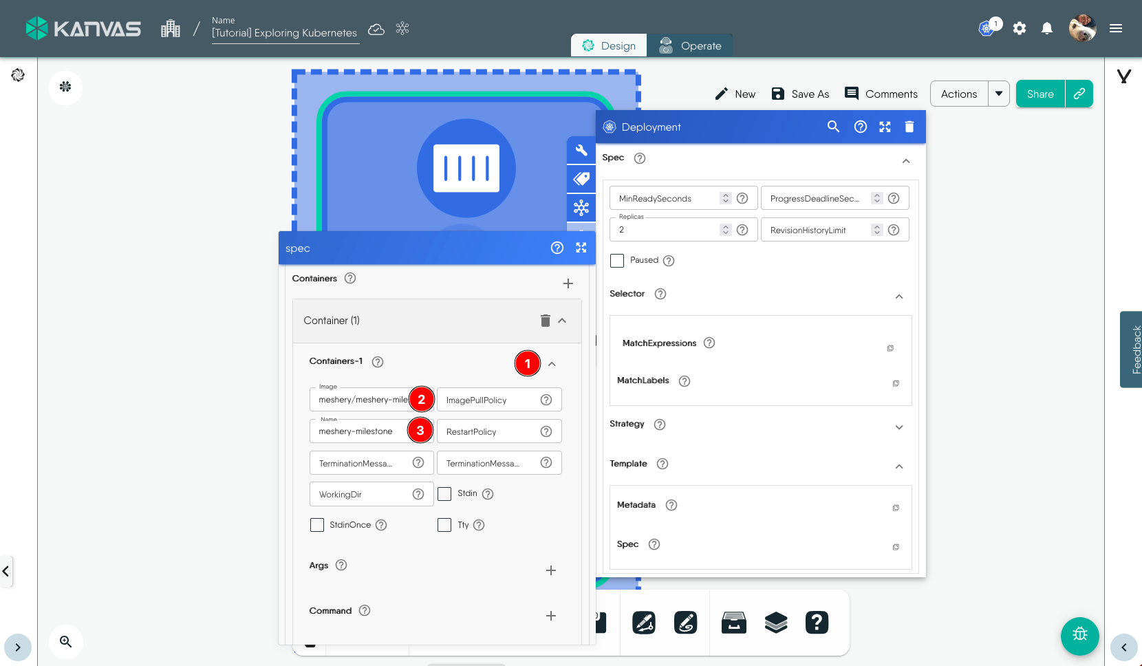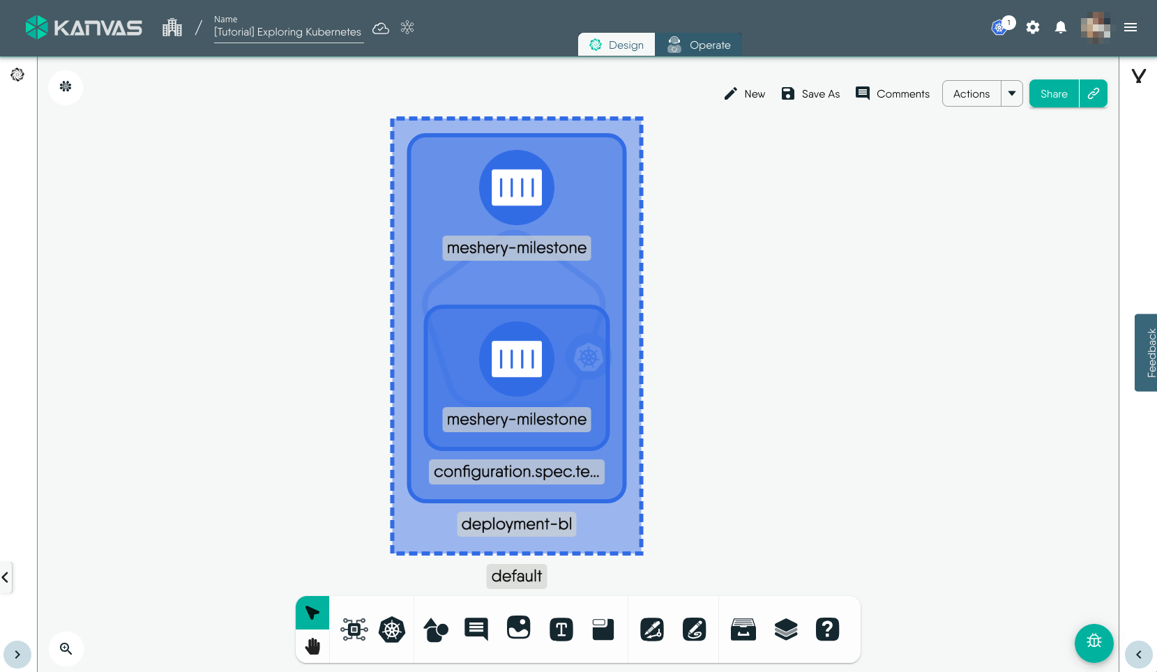 To view and perform operations on the resources deployed, i.e. the Deployment in this exmaple, we will use the Operate functionality of Kanvas. You can open the design in Operate mode during the Deploy workflow or later by click the Operate tab. It will load the deployed resources in Operate view similar to the screenshot below.