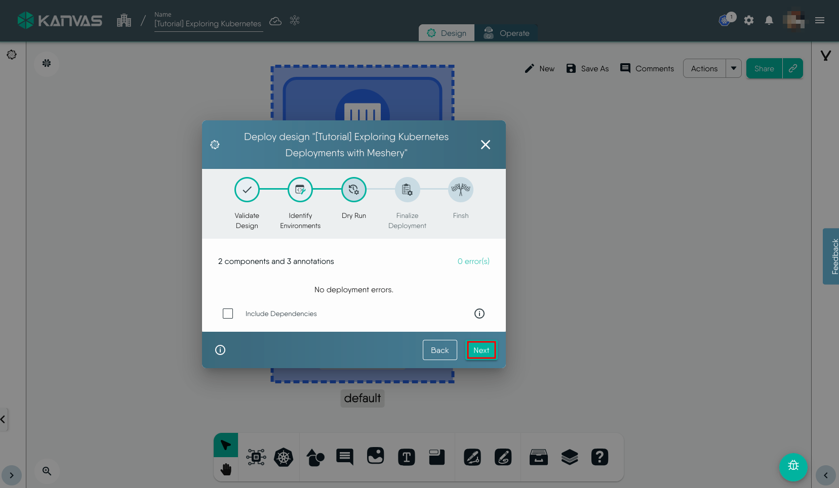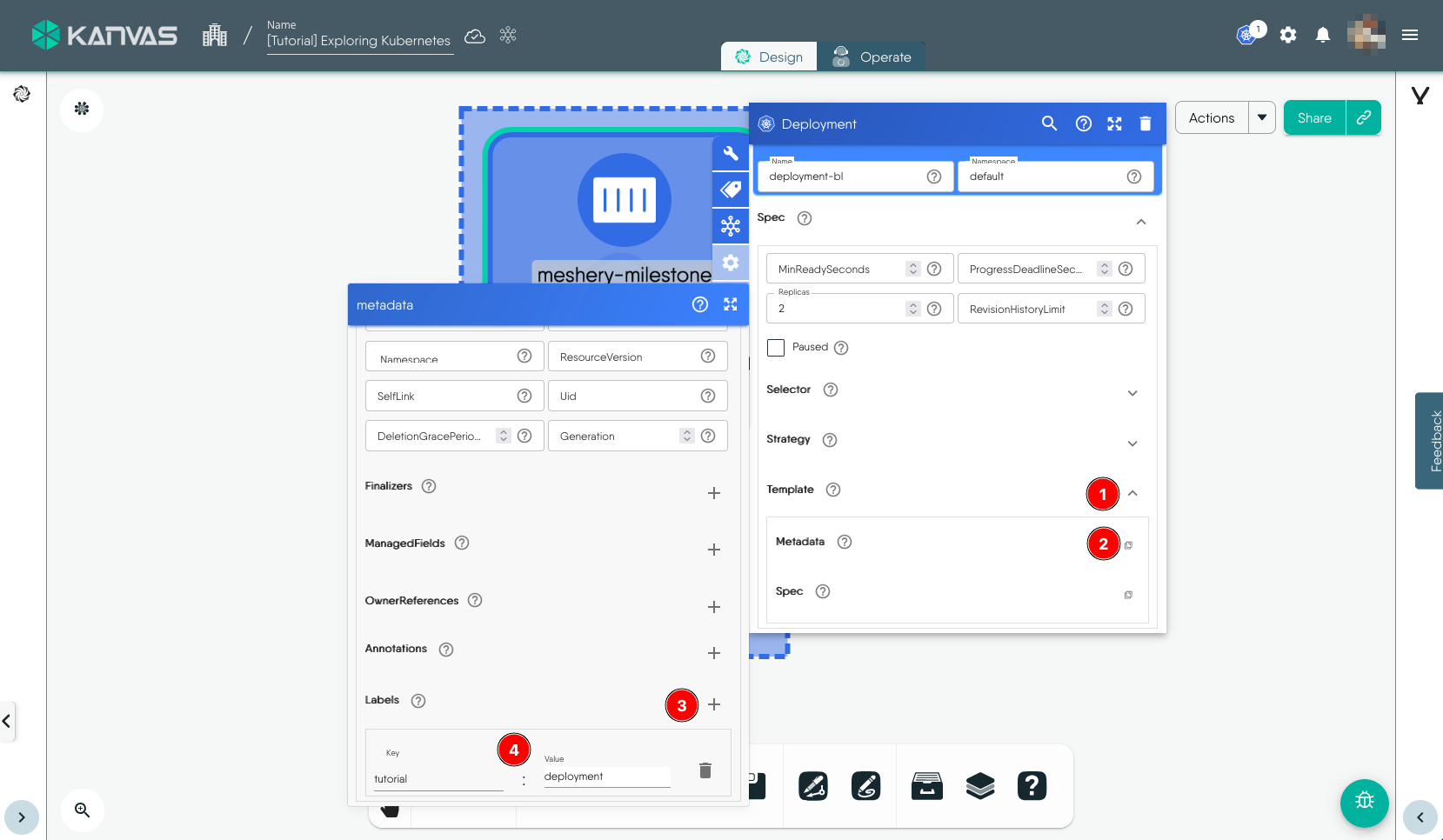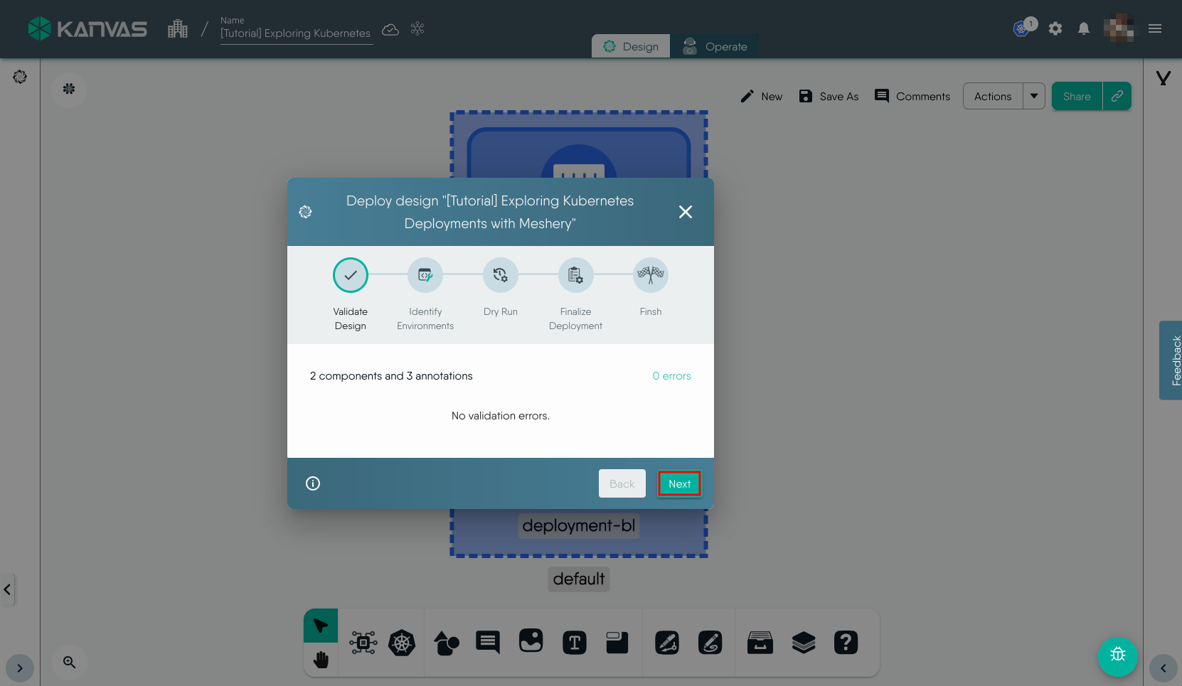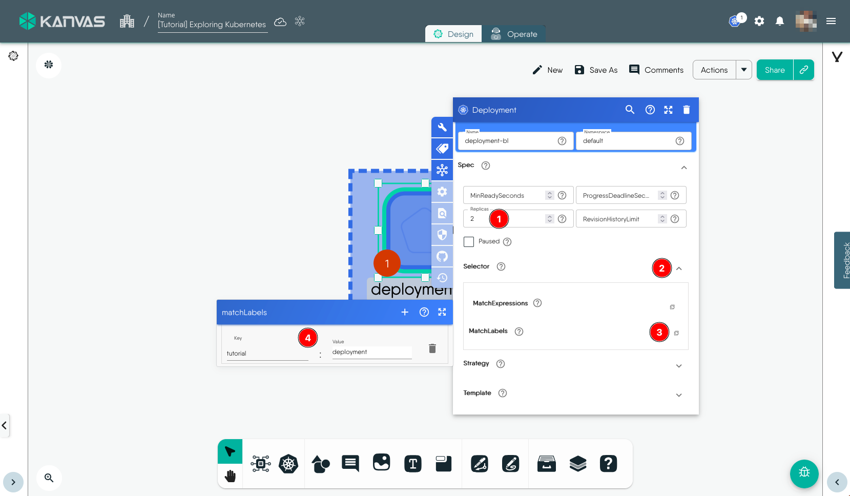 To view and perform operations on the resources deployed, i.e. the Deployment in this exmaple, we will use the Operate functionality of Kanvas. You can open the design in Operate mode during the Deploy workflow or later by click the Operate tab. It will load the deployed resources in Operate view similar to the screenshot below.