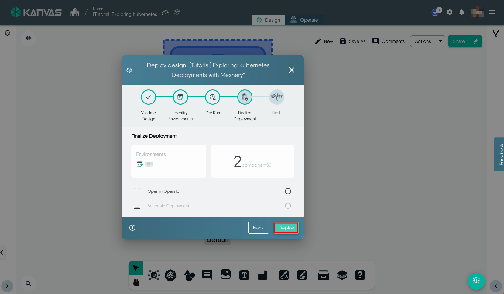 Finally, click Deploy in the next step. You may choose to open the design in Operate mode after this step to explore the resources by checking the Open in Operator checkbox.
