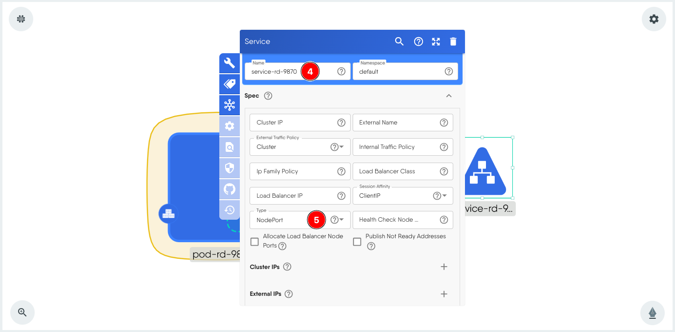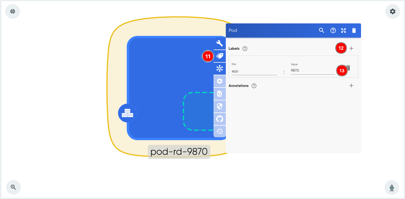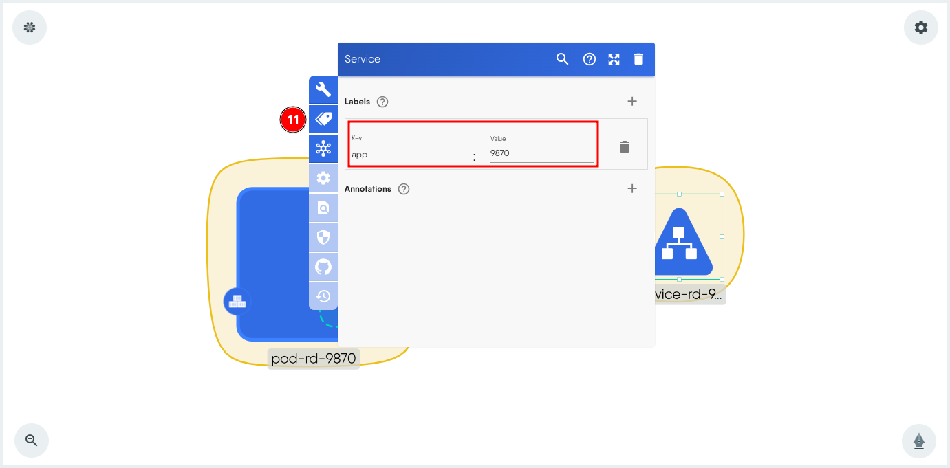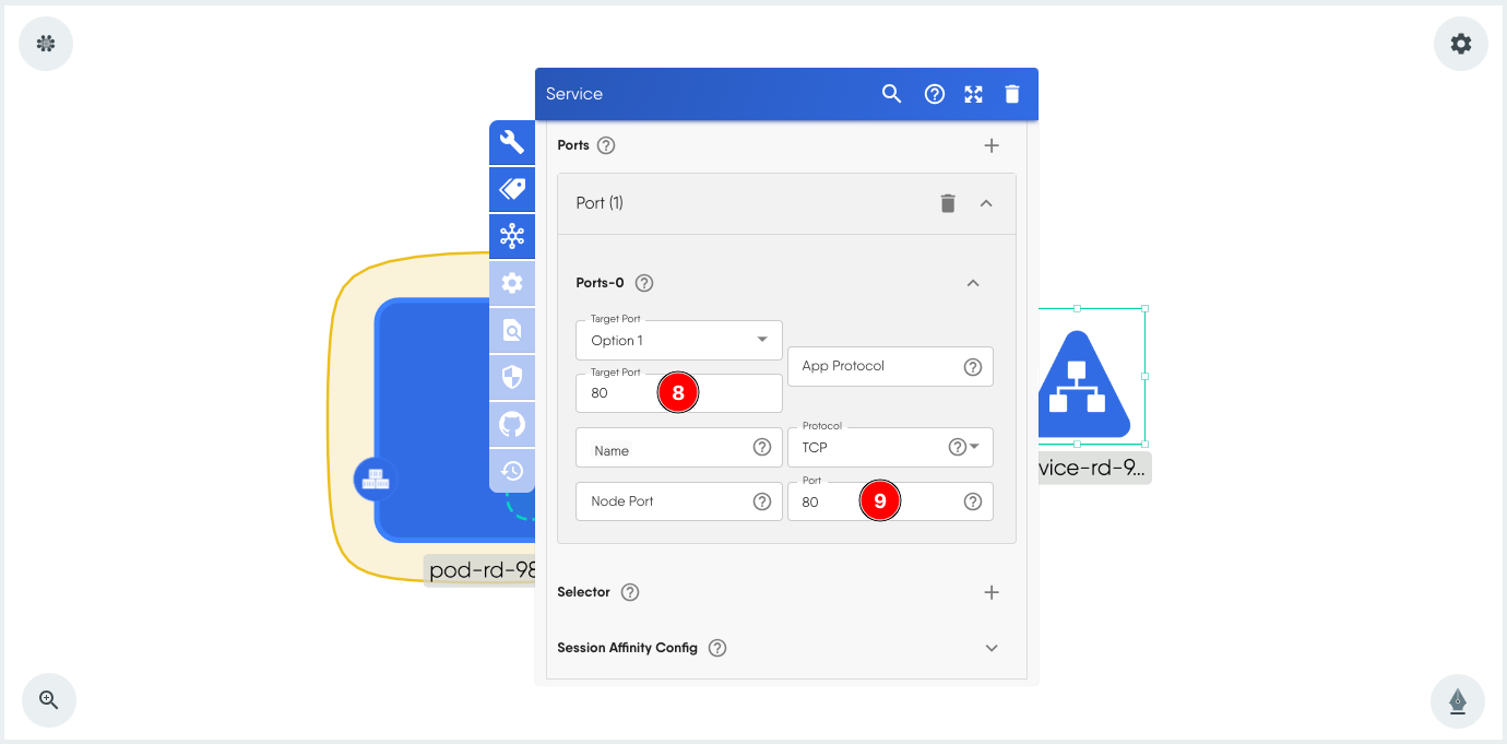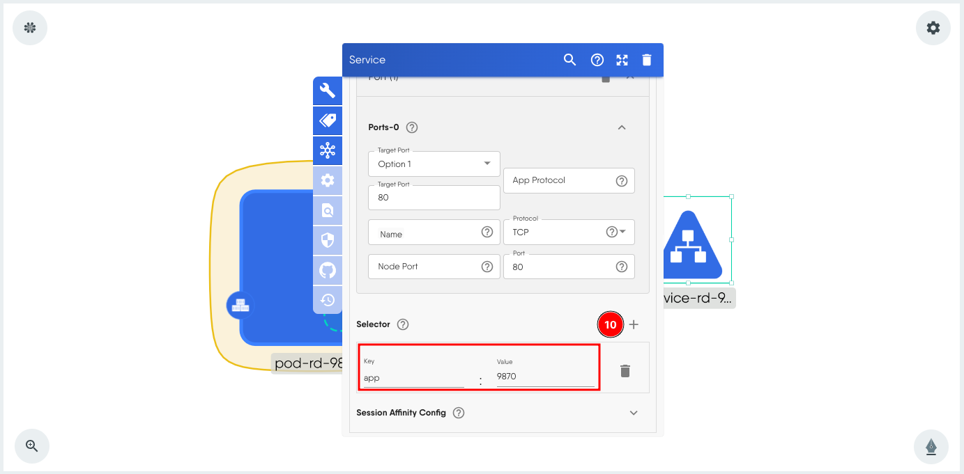 - Click + next to Selector and add the key value pair app:9870. This is the same pair that is used as label in the Pod.
