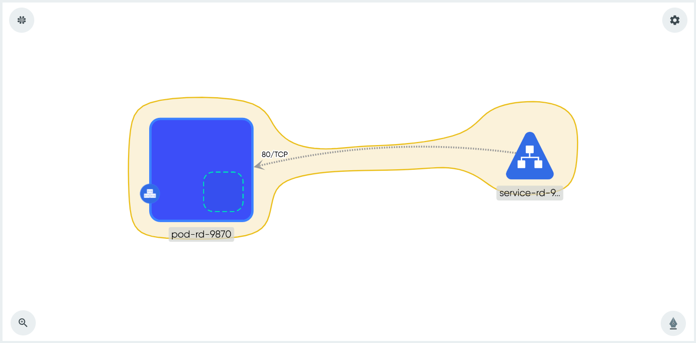- Move your mouse over the service component until you see the green dots on all four sides. Move your mouse over one of the green dots to reveal an arrow, then click the arrow. Select Network option, and then move your mouse to the pod to create the relationship. It should look similar to the screenshot below:
