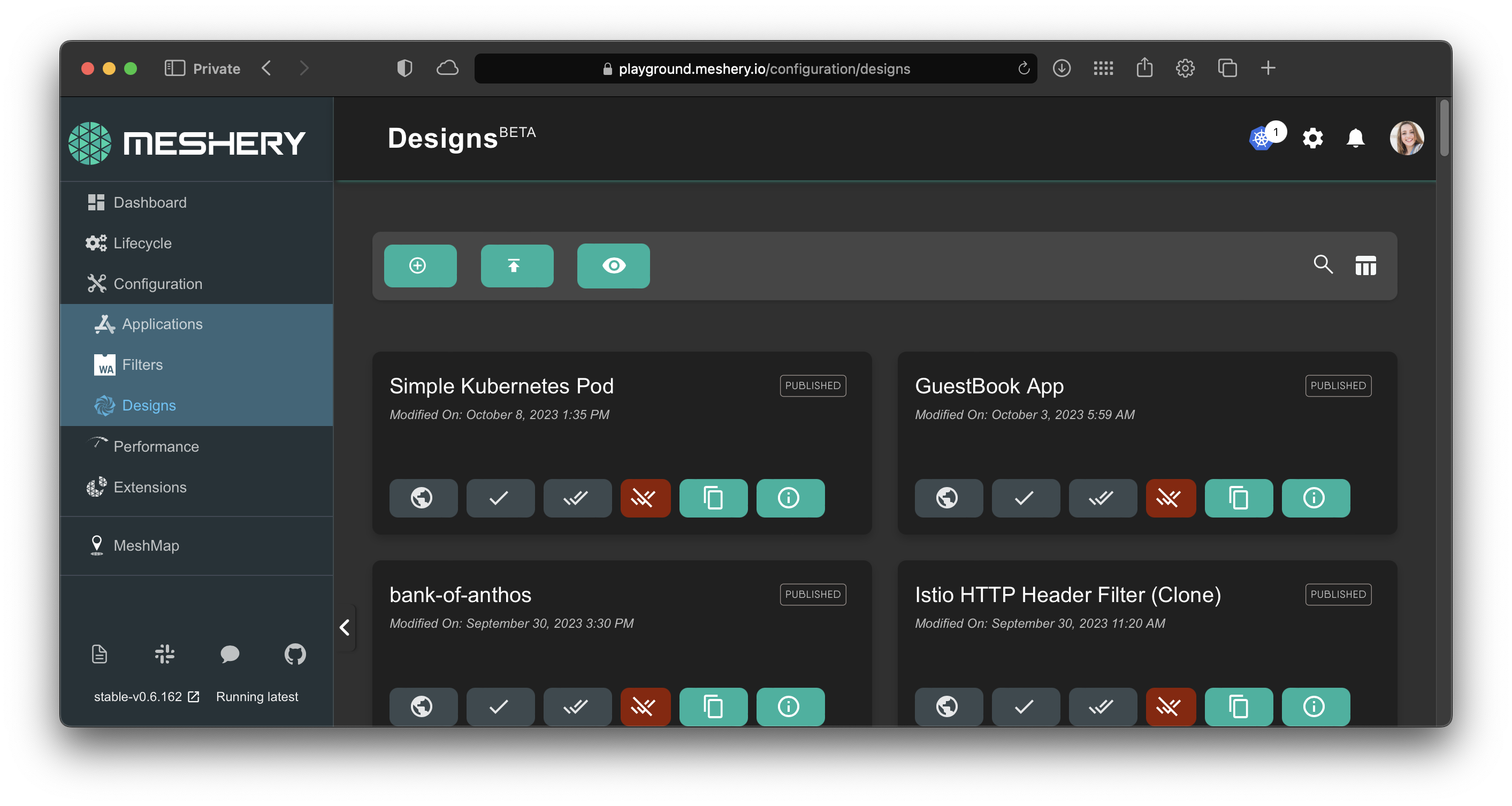 Meshery’s web-based user interface is embedded in Meshery Server and is available as soon as Meshery starts. The location and port that Meshery UI is exposed varies depending upon your mode of deployment. See accessing Meshery UI for deployment-specific details.