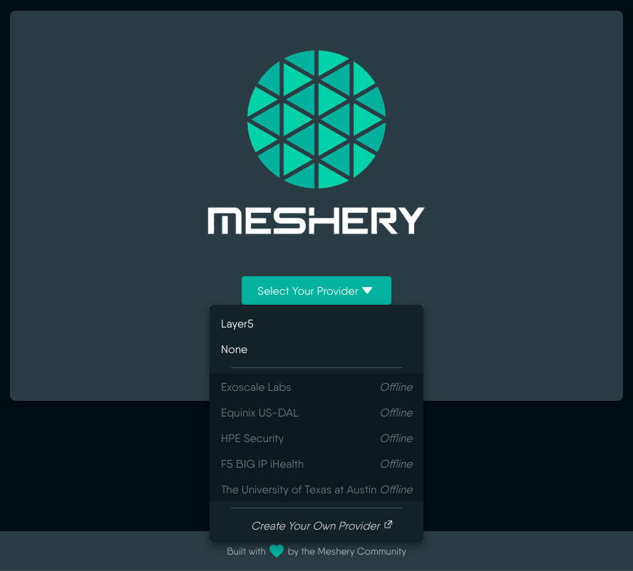Meshery offers Providers as a point of extensibility. It has a built-in Local Provider, named “None” and supports Remote Providers that are designed to be pluggable. Remote Providers offer a point of extension to users / integrators to deliver enhanced functionality such as authentication and authorization, using Meshery as a platform.